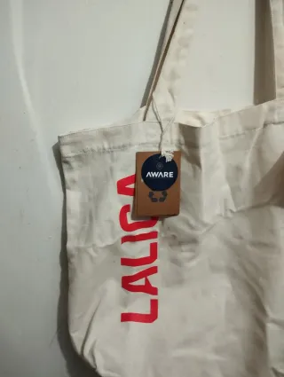 Bolsa de tela reutilizable con el logo de La Liga. - Color blanco crudo. - Diseño con letras rojas. - Etiqueta de la marca AWARE.