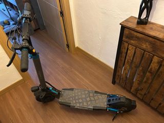 Patinete color azul y negro. Se puede nivelar en altura. Freno de pie. Patilla para aparcarlo. Está en buenas condiciones. Plegable. - Plataforma antideslizante.