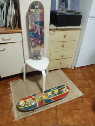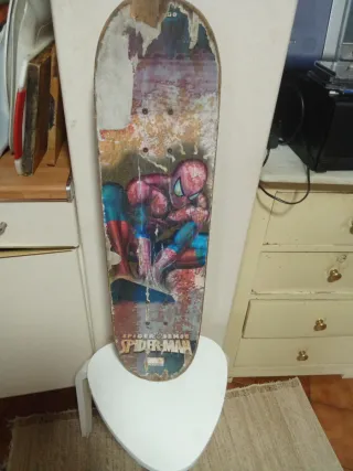 Dos monopatines con diseños llamativos. - Monopatín con diseño de Spiderman. - Monopatín con diseño de Beyblade.