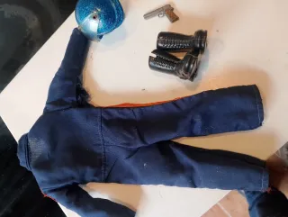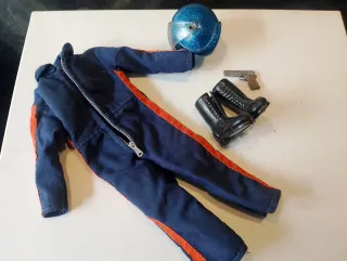 Conjunto de ropa para figura Geyperman.mono de piloto helicóptero, tiene una manga algo descosida - Traje de color azul con franjas naranjas. - Incluye casco azul brillante. - Par de botas negras. Una con una raja - Pistola plateada.