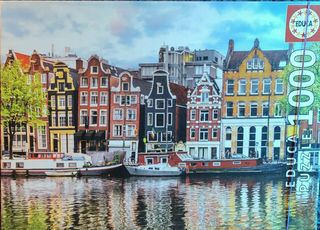 Lote de cuatro puzzles de 1000 piezas cada uno. Ideal para coleccionistas o para disfrutar en familia. - Puzzle 1: Vista de París con la Torre Eiffel. - Puzzle 2: Paisaje de montaña. - Puzzle 3: Bodegón de frutas. - Puzzle 4: Gato.