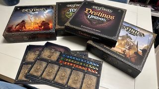 Lote de juegos de mesa Destinies, incluyendo la expansión Destinos Unidos, Mitos & Folklore y el módulo Mar de Arena. - Juego base Destinies. - Expansión Destinos Unidos (2 vs 2). - Módulo Mar de Arena. - Módulo Mitos & Folklore - Tapete de neopreno grande - tapetes de neopreno de jugador premium - Tableros de juego y componentes adicionales. - figuras del juego base pintadas nivel Pro
