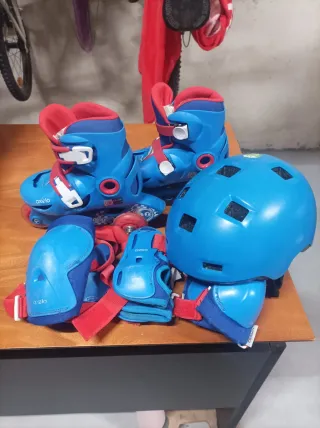 Conjunto de patines en línea, casco y protecciones para patinar de forma segura. El color principal es el azul con detalles en rojo. - Patines ajustables. - Casco con ventilación. - Incluye rodilleras y coderas. Usado en 3 ocasiones