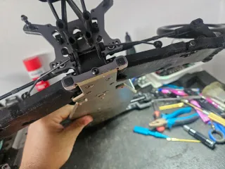 Chasis de coche radiocontrol Tekno 2.1. - Incluye opciones de mejora del modelo 2.2. - Componentes de suspensión y transmisión visibles. Se vende lo que se ve en la fotos no hay mas se regalan dos carocerias usadas.
