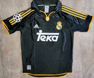 Camiseta del Real Madrid, correspondiente a la equipación que utilizaron en la Final de la Octava Champions League contra el Valencia (temporada 99-00). Tiene el nombre de R. Carlos y el número 3. Fabricada en Portugal (foto 3). Talla L. Medidas (fotos 4 y 5): 52,5 cm ancho (axila a axila) x 71,5 cm alto (del hombro a abajo). En perfecto estado (10/10)
