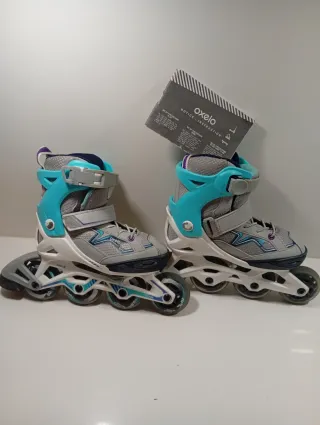 Par de patines en línea Oxelo para niña, en muy buen estado. Son ajustables para adaptarse al crecimiento. - Color gris, turquesa y morado. - Cierre de velcro y hebilla. - Ruedas de poliuretano.