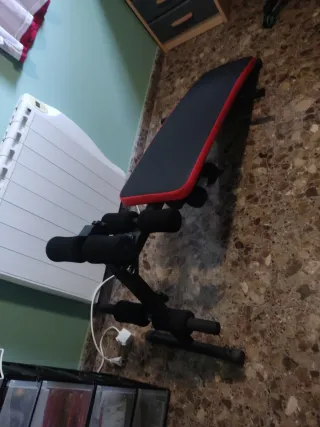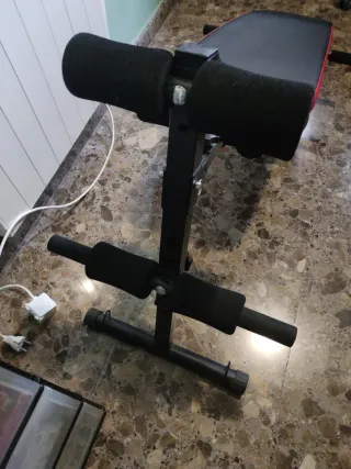 Banco de ejercicios para entrenar en casa. Ideal para rutinas de abdominales y otros ejercicios. - Tapicería negra con ribete rojo. - Estructura metálica. - Rodillos acolchados para soporte. - Lo tengo montado pero no he llegado a usarlo. - Con libro de instrucciones