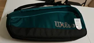 Raquetero Wilson Super Tour en color verde azulado y negro para 9 raquetas. Nuevo con etiquetas. - Diseño moderno y espacioso. - Logo de Wilson en color gris plateado. - Etiqueta original adjunta.