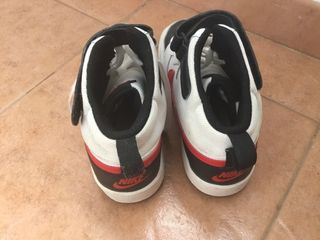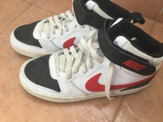 Zapatillas deportivas Nike de caña media, con un diseño moderno y llamativo. - Combinación de colores blanco, negro y rojo. - Cierre con cordones y correa de velcro. - Logo de Nike en el lateral y en la lengüeta.