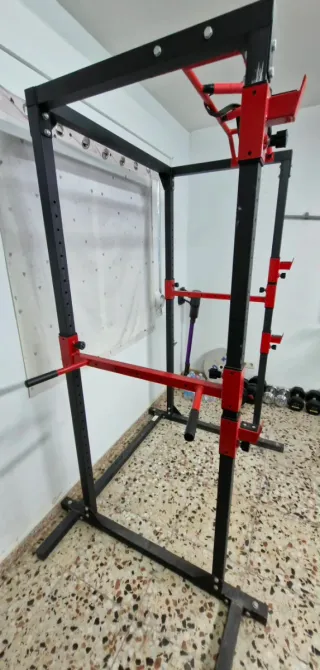 Jaula de potencia robusta, ideal para entrenamientos en casa o gimnasio. Estructura de acero resistente con acabado en negro y detalles en rojo. - Barra de dominadas integrada. - Soportes ajustables para barra. - Barras de seguridad. - Base estable. - Barra para fondos. - Medidas: 215x115x80 alto X ancho X profundo. Diámetro 5X5