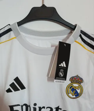 Camiseta oficial del Real Madrid. - Diseño blanco con detalles en amarillo y gris. - Logo de Adidas y escudo del club. - Patrocinio de Emirates y HP. - Talla S - Precio negociable
