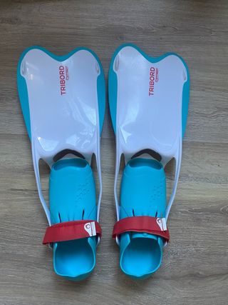Aletas de natación de la marca Tribord, diseñadas para mejorar el rendimiento en el agua. Son cómodas y seguras. - Pala de color blanco y azul. - Calzante de color azul. - Cintas de ajuste rojas. 40-41