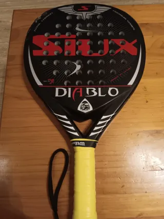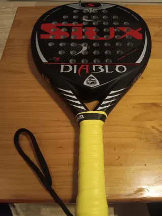 Pala de pádel Siux Diablo con tecnología Grapheno y Total Carbon. - Marco de carbono. - Superficie de carbono. - Golpe lateral en la cabeza, llevaba un protector y no se veía. Seguí jugando con ella, va perfecta por feo que es el golpe. - Resto de la pala en buenas condiciones.