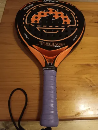 Pala de pádel Jhayber Attack Master 2 en color negro y naranja. Estupenda pala de control. Rozaduras en la cabeza, sin desconchones ni rajas. En prefecto estado de juego.