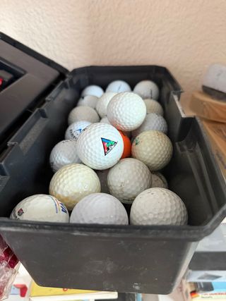 Caja negra con varias pelotas de golf. - Pelotas de golf de diferentes marcas. - Ideal para practicar o jugar.
