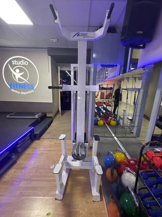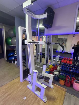 Equipo de gimnasio para entrenamiento de fuerza. - Estructura robusta de acero. - Diseño para ejercicios de dominadas y fondos. - Incorpora un sistema de asistencia para facilitar el movimiento.
