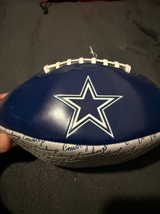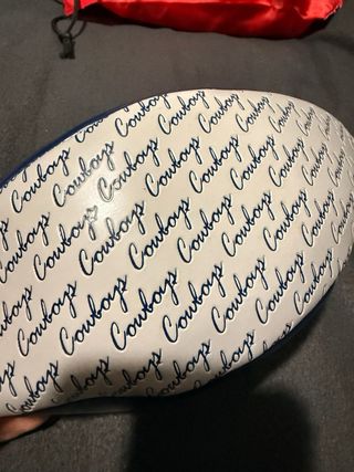 Pelota de fútbol americano con el logo de los Dallas Cowboys de la NFL. Diseño en azul y blanco con el nombre del equipo repetido en la parte inferior. - Logo de los Dallas Cowboys. - Diseño NFL.