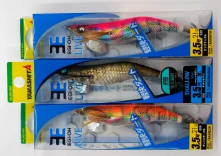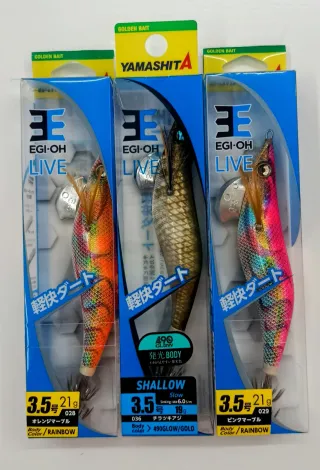 Tres señuelos de pesca EGI-OH LIVE de la marca Yamashita. - Modelo: 3.5 - Peso: 21g - Colores: Naranja Marble, 490GLOW/GOLD, Rosa Marble - Tipo: Shallow