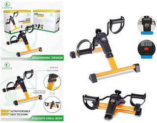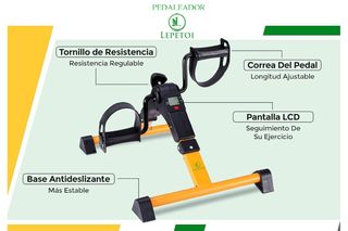 Pedaleador LEPETOI sin usar, ideal para rehabilitación o ejercicio en casa. Su diseño plegable lo hace fácil de almacenar. - Tornillo de resistencia regulable. - Pantalla LCD para seguimiento del ejercicio. - Base antideslizante para mayor estabilidad. Pedaleador Estático Plegable de rehabilitación para piernas y brazos Con Pantalla LCD e Intensidad Ajustable Marca: Letoi Fabricante: Yongkang Synteam Science & Technology Co., Ltd Características: Plegable. Con pantalla LCD. Intensidad Ajustable. Peso: 2,7 Kg. Dimensiones: 33x37x26cm Pilas: 1LR44 Color: Amarillo. Material: Aluminio. Control: Manual. Conservación: Sin estrenar.