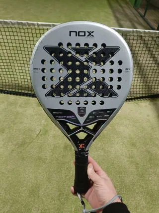 Pala de pádel Nox AT10 Pro Cup 2024 en muy buen estado, poco uso y con marcas normales que no afectan al juego. Es una pala polivalente con forma de lágrima, pensada para jugadores de nivel medio-avanzado que buscan un equilibrio real entre control y potencia en cada golpe. Su núcleo EVA HR3 y materiales resistentes aportan buena salida de bola, comodidad y durabilidad en la pista. Peso aprox. 370 g, manejo ágil y sensación cómoda en todo tipo de situaciones. La vendo por falta de uso. Ante cualquier duda, no dudéis en escribirme.