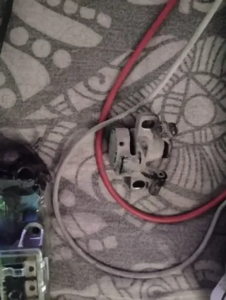 Conjunto de piezas para patinete Xiaomi. - Cable rojo enrollado. - Rejilla gris. - Soporte blanco con abrazaderas. Rueda trasera maciza y delantera batería y centralita pinza freno y más piezas orquilla paragolpe trasero