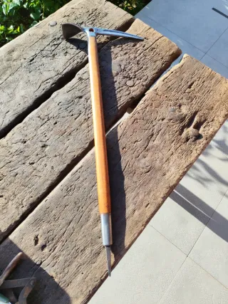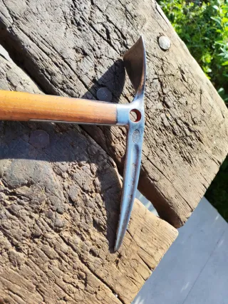 Piolet con mango de madera y cabeza de metal. - Mango de madera. - Cabeza de metal con punta y pala. - Francés SIMOND SUPER E 75 CM DE LARGO y Cabeza 28 CM