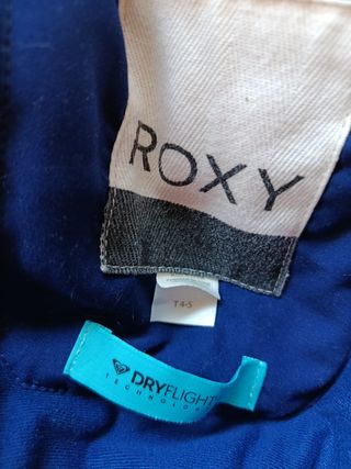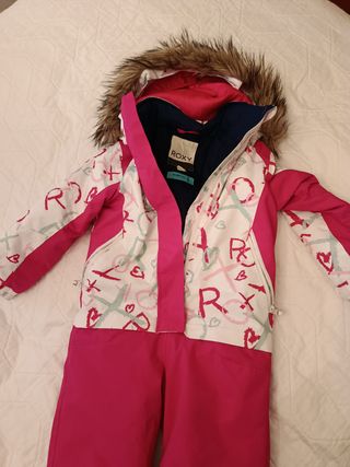 Traje de esquí para niña de la marca Roxy. Ideal para disfrutar de la nieve con estilo y comodidad. Talla 4/5¡ - Diseño estampado con letras y corazones. - Color principal fucsia. - Capucha con pelo sintético.