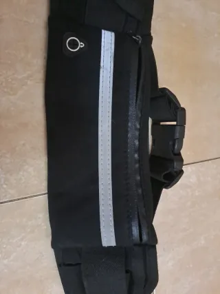 Riñonera negra con detalles reflectantes, ideal para actividades deportivas. - Diseño alargado y compacto. - Cremallera central. - Correa ajustable con cierre de hebilla. - Anilla para colgar.