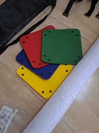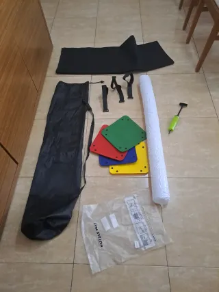 Set de alfombra para puzzles con accesorios. - Alfombra enrollable de color negro. - separador de piezas de puzzle de colores (rojo, verde, azul, amarillo). - Inflable. - Bolsa de transporte. - Bomba de inflado. - Correas de sujeción.