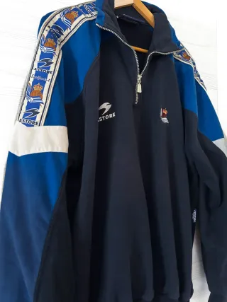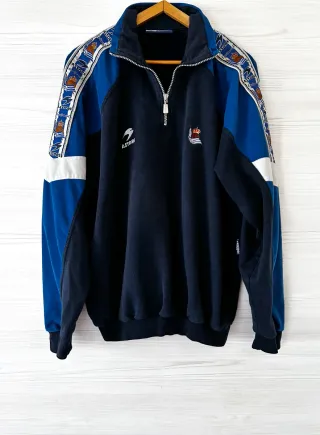 Sudadera original y oficial de la Real Sociedad de fútbol. Sudadera que no es de aficionado ni merchandising del equipo. Prenda oficial de uso deportivo del club. Años 1998-2000. - Talla XL marcada en etiqueta pero más cercana a una M-L. - Medidas: 67x63 aproximadamente - En perfecto estado a pesar de los años.