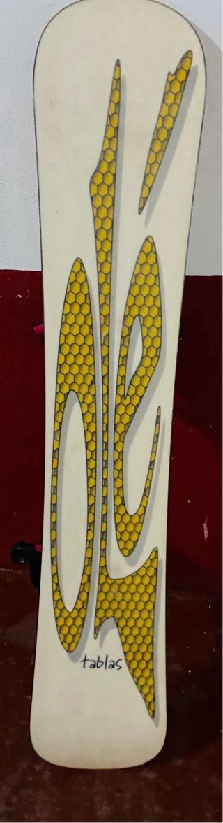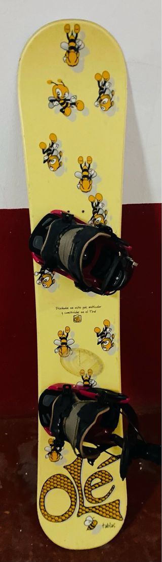 Tabla de snowboard para niños con un divertido diseño. Fijaciones Flow semiautomaticas 150cm de largo x 26cm ancho - Base amarilla con ilustraciones. - Fijaciones incluidas - Diseño Olé con patrón de panal.