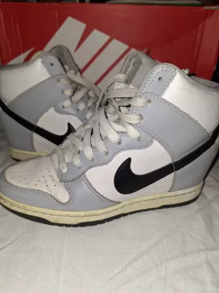 Zapatillas Nike Dunk High Wedge en tonos grises y blancos. Un clásico con un toque moderno. - Diseño de caña alta. - Combinación de cuero y ante. - Swoosh lateral en negro.talla 37, E5 c2.1