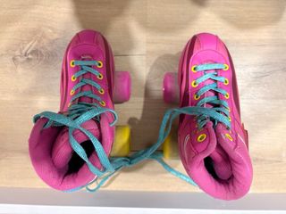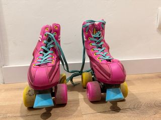 Patines de cuatro ruedas con un diseño llamativo en color rosa y detalles en turquesa. patines usados pero en buenas condiciones. talla 30/31