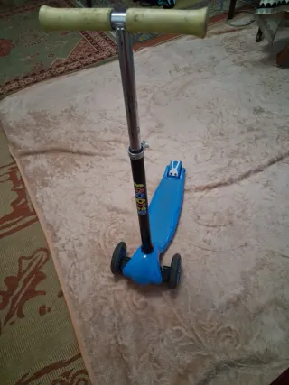 Patinete para niños, en buen estado. Es de color azul y rosa pastel, con dibujos infantiles. - Tres ruedas para mayor estabilidad. - Diseño ligero y fácil de manejar. - Ideal para niños pequeños.