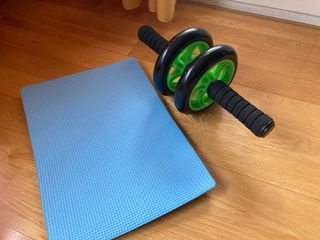 Set de entrenamiento para abdominales que incluye una rueda doble y una esterilla azul. - Rueda con doble banda para mayor estabilidad. - Asas ergonómicas para un agarre cómodo. - Esterilla de material texturizado.