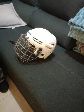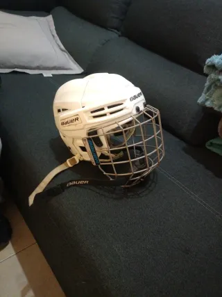 Casco de hockey de la marca Bauer, color blanco. - Protección facial de rejilla metálica. - Correa de ajuste. - Diseño ventilado.