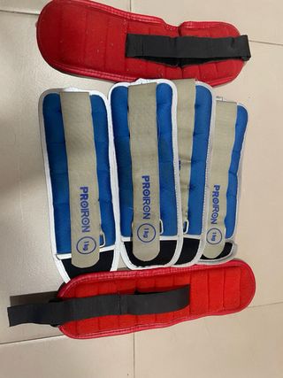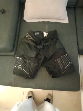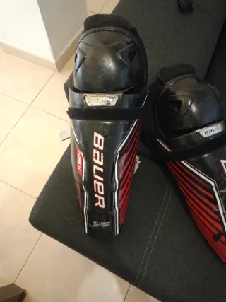 Protecciones para hockey Bauer NSX. - Talla 15 / 38cm. - Diseño en negro con detalles en rojo y blanco. - Cierre de velcro ajustable.