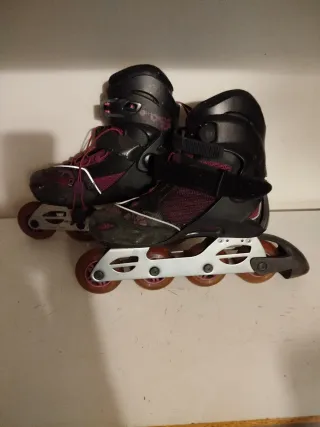 Se venden patines en línea K2 en color morado y negro. - Cierre de velcro y cordones. - Ruedas de color rosa. - Marco plateado.
