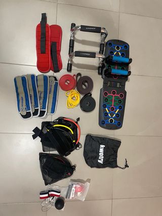 Conjunto de accesorios para entrenamiento en casa. - Mancuernas de tobillo y muñecas varias. - Barras de flexión. - Tabla de flexiones. - Bandas de resistencia de varios colores. - Bolsa de transporte negra. - Pelota boxeo -