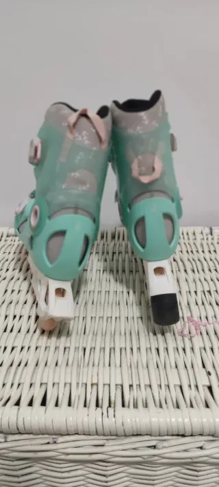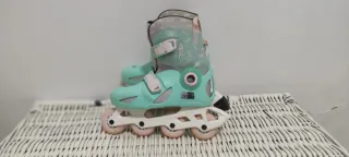 Patines en línea Oxelo ajustables para tallas 32 a 34. Diseñados para ofrecer comodidad y estabilidad. - Color verde menta y gris. - Cierre con velcro y hebilla. - Ruedas de color rosa pálido.