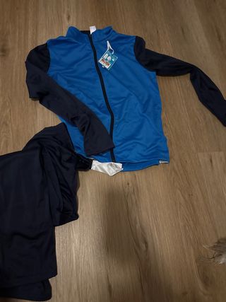 Conjunto de chándal infantil de Decathlon, ideal para actividades deportivas o para el día a día. Compuesto por chaqueta y pantalón. - Chaqueta azul con mangas y detalles en marino. - Pantalón de color marino. - Cierre de cremallera en la chaqueta.