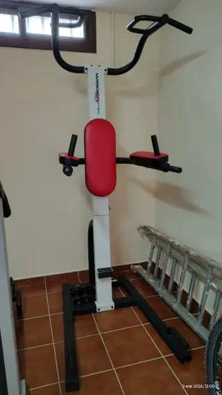 Estación de entrenamiento multipower para ejercicios de dominadas y otros. - Estructura robusta de color blanco y negro. - Asiento y soportes acolchados en color rojo. - Barras de agarre ergonómicas.