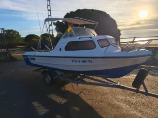 Barco Swift Craft MKT con remolque para varadero 5 metros de eslora y 2 de manga depósito de 30 litros bomba de achique goma de valdeo todos los elementos de seguridad sonda Garmin 7 y muchos detalles mas Motor Mercury 75 CV 4T recién revisado sineblok de motor nuevos cambio de aceite y filtro aceite de cola etc se puede ver y provar todo funcionando perfectamente - Casco blanco y azul. - Cabina con ventanas. - Toldos. - 8 Cañeros - Bandera española Telf 609033808
