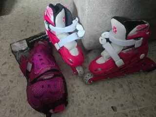 Set de patines en línea para niña, talla ajustable de 27 a 30. Incluye protecciones. - Color rosa y blanco con detalles florales. - Cierre con velcro y hebilla. - Protecciones para rodillas, codos y muñecas.