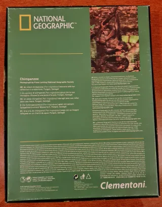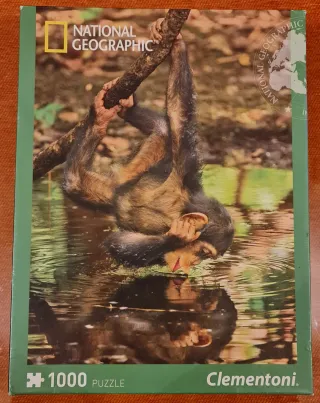 Puzzle de 1000 piezas de National Geographic, fabricado por Clementoni. Ideal para amantes de la naturaleza y los rompecabezas. - Imagen de un chimpancé bebiendo agua. - Reflejo del animal en el agua.