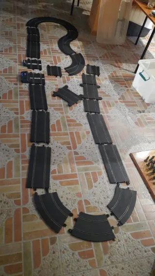 Circuito de Scalextric para montar y disfrutar. - Variedad de tramos rectos, curvos y puente. - Incluye dos mandos y dos coches, aunque uno no parece no estar bien.