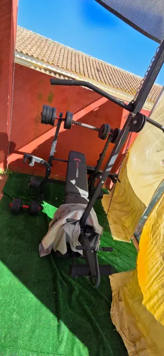 Banco de musculación multifunción con 2 juegos de pesas incluido. Ideal para entrenar en casa. - Banco con asiento acolchado. - Barra de pesas con discos. - Sistema de poleas para ejercicios variados. - solo esta un poco sucio, se entregaría limpio.