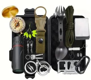 Kit de supervivencia completo para actividades al aire libre. - Brújula. - Monocular. - Cuchillo multiusos. - Cuerda. - Manta térmica. - Encendedor. - Anzuelos y plomos. - Tarjeta multiherramienta. - Mosquetón.
