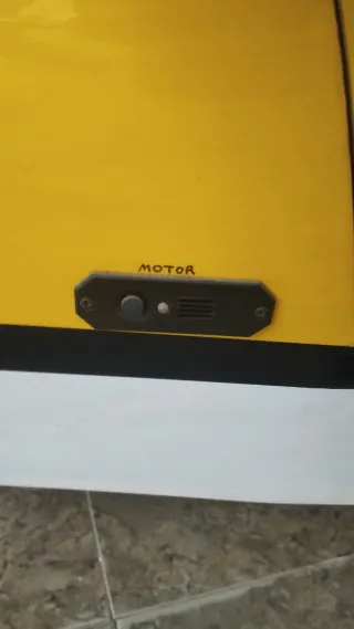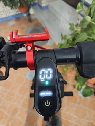 Patinete eléctrico con pantalla digital y soporte para móvil. - Pantalla digital con indicador de velocidad (km/h). - Indicador de modo de conducción (ECO, S). - Indicador de nivel de batería. - Botón de encendido/apagado. - Soporte para móvil de color rojo.