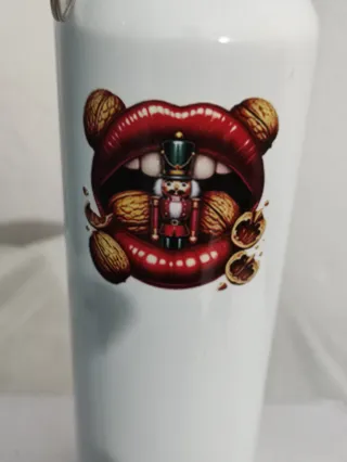 Botella de agua reutilizable con un diseño llamativo. Perfecta para llevar tus bebidas a todas partes. - Capacidad de 750ml. - Diseño Navidad con labios rojos, nueces y cascanueces. - Incluye mosquetón para colgar.